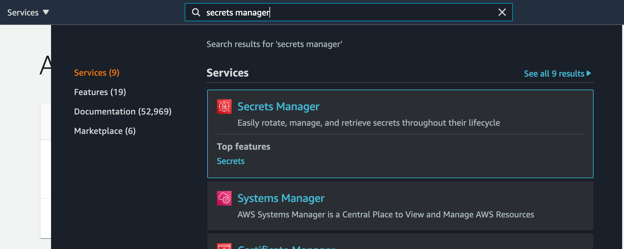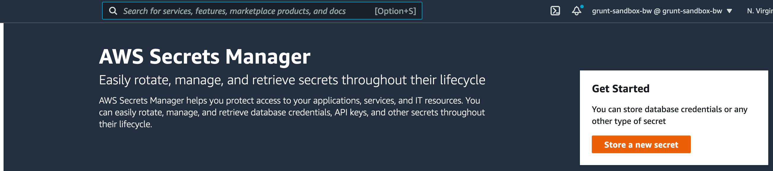 To create a secret in AWS Secrets Manager, first open the AWS console for the shared AWS account, and navigate to the Secrets Manager console.
