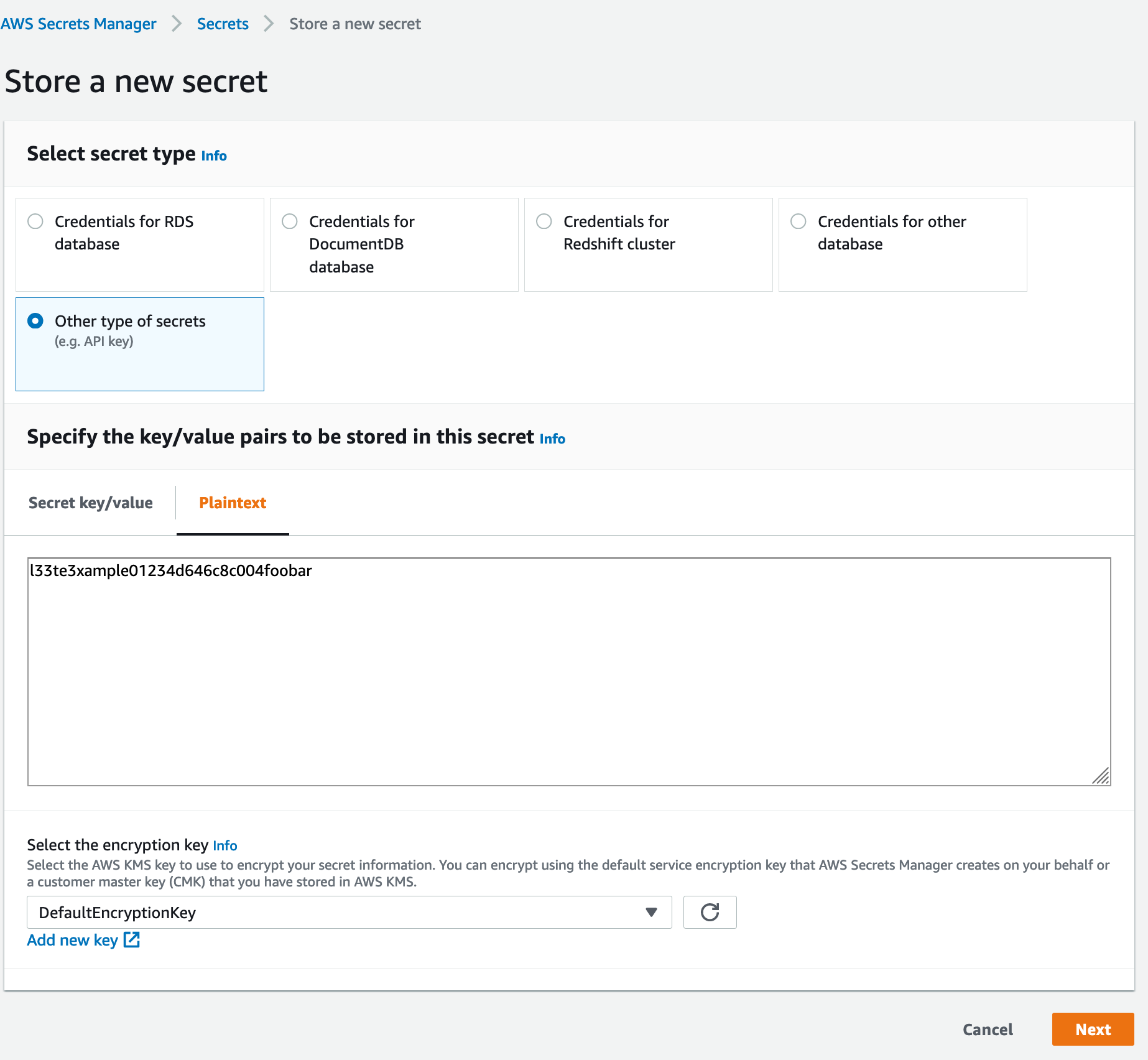 Next, choose Store a new secret.