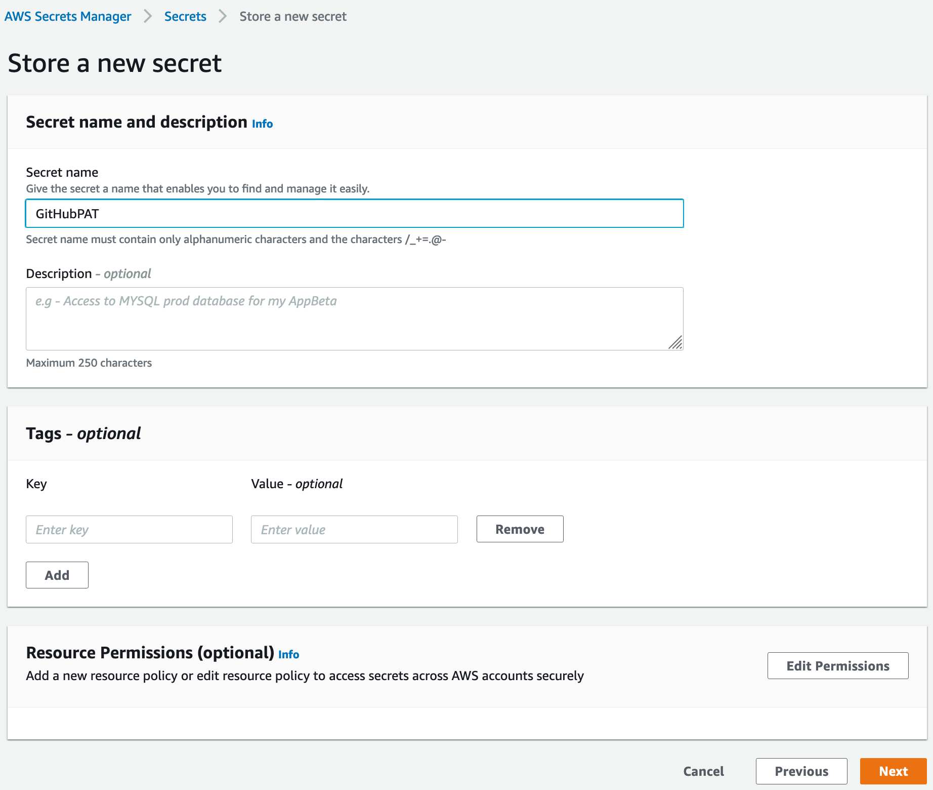 repo,user:email, andadmin:public_keypermissions. You should includeGitHub-MachineUser-PATas part of the name/description of the token to be able to identify it later. - Once you have the PAT, create a new AWS Secrets Manager secret in the shared account.  You can use any name you wish for this secret, but it's recommended you include