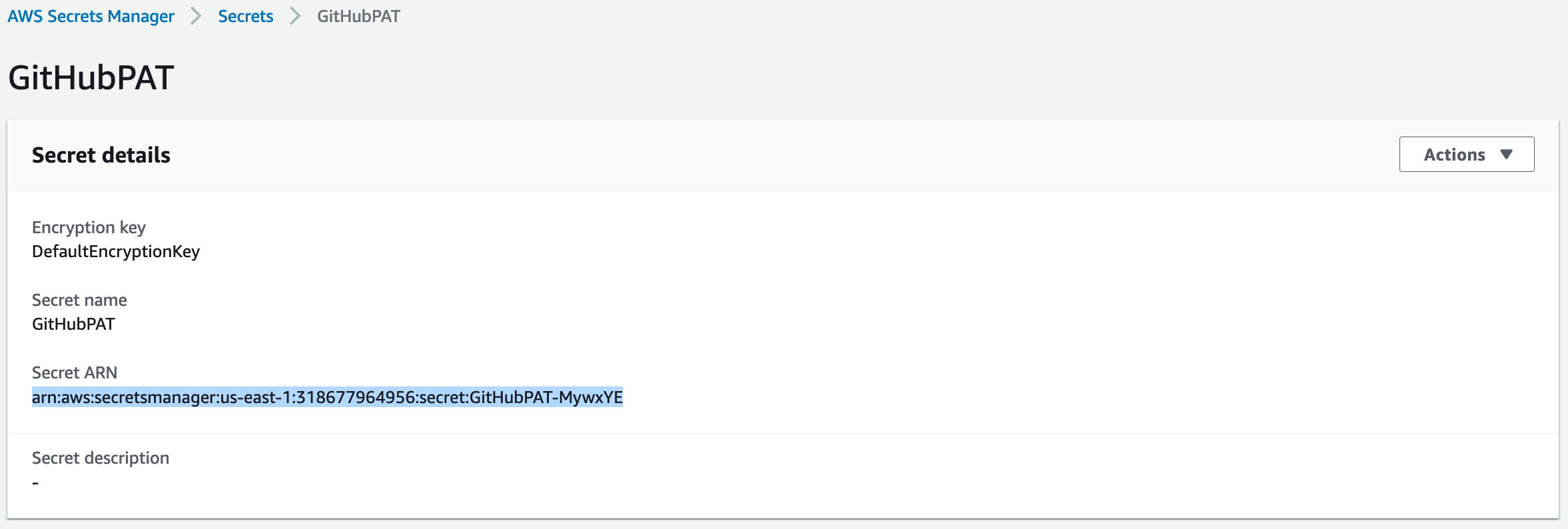 Choose a name for the secret (we’ve chosen GitHubPAT here), then click Next through the remaining screens and save the secret. Once the secret is created, you’ll find it in the list of secrets. If you click on the secret, you’ll see the secret ARN in the fields.